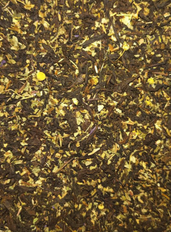 Купаж на основе чёрного чая, листочков земляники и мальвы, отличается терпким вкусом и ароматом с едва различимвми нотками ромашки и мяты.