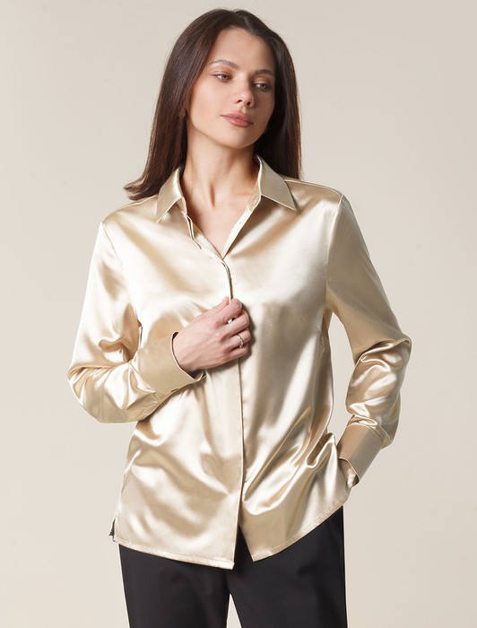 Состав: 94%ПЭ 6%ПУ Плотность: 110 Г/м2 Параметры модели на первом фото: Рост 170, бюст 89, талия 63, бедра 92Блузка прямого силуэта выполнена из эластичного струящегося сатина. Невероятно женственная модель в тренде на пижамный стиль, изящно струится и драпируется по фигуре, напоминая натуральный шелк. Лаконичный дизайн поддерживает застежка планка на потайные пуговицы. Сочетайте изделие с жакетами и строгими брюками, внося в образ легкое настроение.