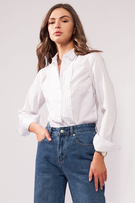 Состав: 62%Хлопок 38%ПЭКлассическая полуприлегающая блузка с эффектвными складками спереди. Стилизована под мужскую сорочку под смокинг. Такая строгость с женственными низами создает соблазнительный образ, даже когда требуется самый строгий дресс-код. В состав ткани к хлопку добавлен полиэстер, который обеспечивает формоустойчивость, комфорт в уходе и долговечную белизну блузки.