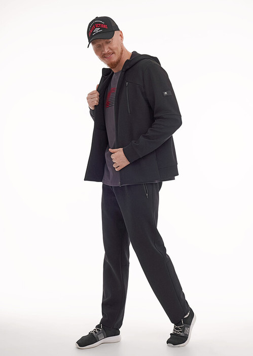 Прямые мужские зауженные брюки из трикотажного полотна с регулируемой талией. Функциональность модели придают боковые карманы, а интересным акцентом в изделии является фирменная фурнитура и дизайнерский принт. Брюки эргономичные и удобные.
