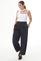 Брюки прямые, широкие из текстильного полотна штапель. Притачной пояс со шлевками, гульфиком и застежкой на молнию, крючок. Боковые карманы с отрезным бочком. По спинке вытачки, спереди металл нашивка на шлевке.