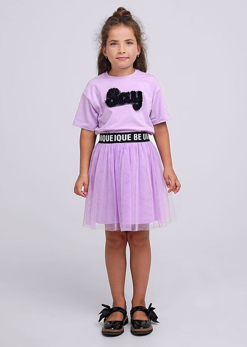Нарядная футболка для девочки дополнена мягкой объемной апликацией. Базовый покрой. Выполнена из хлопкового трикотажа с эластаном.