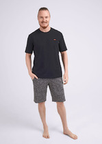 Комплект мужской состоящий из футболки и брюк. Футболка из трикотажного полотна в набивку с коротким рукавом и дизайнерской нашивкой. Брюки из трикотажного полотна на широком поясе с резинкой и регулируемым шнуром, по бокам удобные карманы.