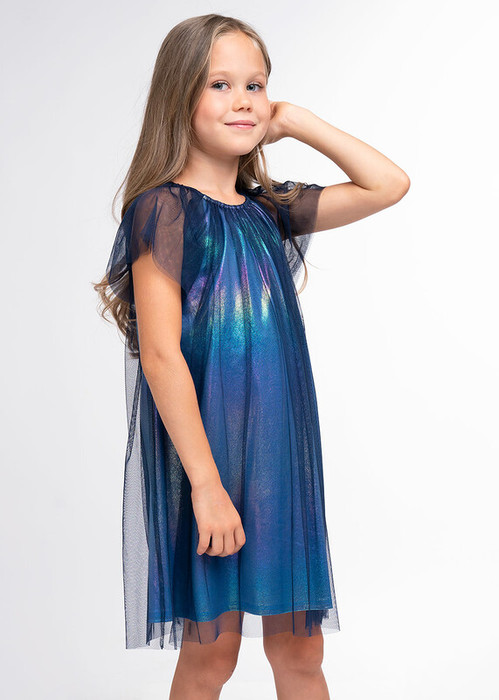 Нарядное платье из трикотажного полотна с блеском и мягкой сеткой сверху. Силуэт А-образный. Пышные рукава,горловина с эластичной тесьмой без застежки.