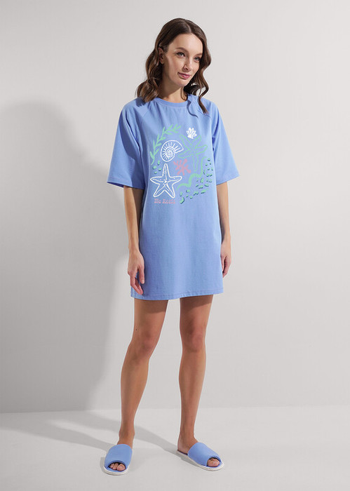Платье для дома и отдыха прямого силуэта из трикотажного полотна. Короткий рукав реглан. По горловине обтачка с застилом. По спинке средний шов с застилом. По низу рукаву и изделия подгибка с застилом. Боковой разрез. Спереди и на спинке принт.