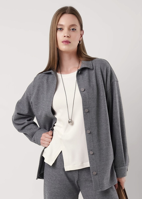 Куртка прямого силуэта из трикотажного полотна джерси. Отложной воротник на стойке. По переду планка с застежкой на пуговицы, на спинке кокетка с бантовой складкой. Длинный рукав со спущенной линией плеча, внизу манжет на пуговице. Фигурный низ изделия.