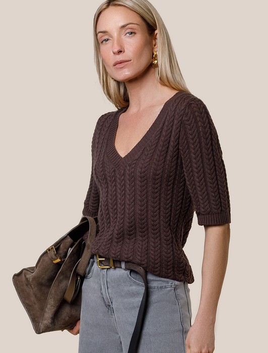 Состав: 70%Хлопок 21%ПА 9%Кашемир Плотность: 12 GG Размер товара на первом фото: 42Джемпер фактурной вязки выполнен из хлопка с добавлением кашемира. Модель с V-вырезом с вывязанным орнаментом цепи. Мягкая и очень приятная пряжа совершенно не колется, сохраняет тепло при этом не перегревая, гарантируя безупречный комфорт.