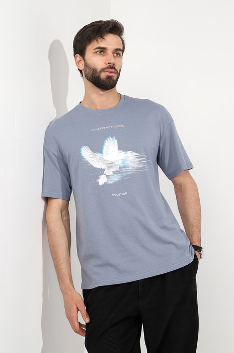 Футболка мужская из гладкокрашеного трикотажного полотна "кулирка", свободного покроя, со спущенным плечом и втачными короткими рукавами. Горловина овальной формы обработана втачной планкой. По шву втачивания планки настрочена двойная отделочная строчка. В центре переда - принт, выплненный в технике шелкографии.
