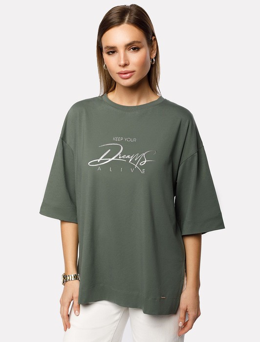Состав: 92%Хлопок 8%ПУ Плотность: 170 Г/м2 Параметры модели на первом фото: Рост 170, бюст 89, талия 63, бедра 92Перевод принта: Keep your dreams alive - не забывай мечтать. Футболка выполнена из эластичного хлопка. Авторский принт нанесен фактурной краской с устойчивым покрытием. Модель дополнена боковыми разрезами и фирменным логотипом бренда по низу изделия. Спинка немного длиннее. Свободный крой подходит для любой фигуры и не сковывает движений.