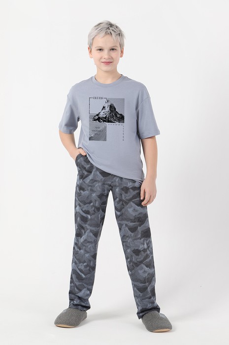 Костюм для мальчика из трикотажного полотна "кулирка" в комбинации двух видов , состоящий из футболки и брюк. Футболка - из гладкокрашеного полотна, свободного покроя, со спущенным плечом, короткими втачными рукавами, горловиной овальной формы, обработанной втачной планкой, и принтом в центре переда. По шву втачивания планки настрочена двойная отделочная строчка. Брюки - из полотна с набивным рисунком, на притачном поясе с эластичной тесьмой внутри, с карманами в боковых швах. Входы в карманы окантованы основным материалом.