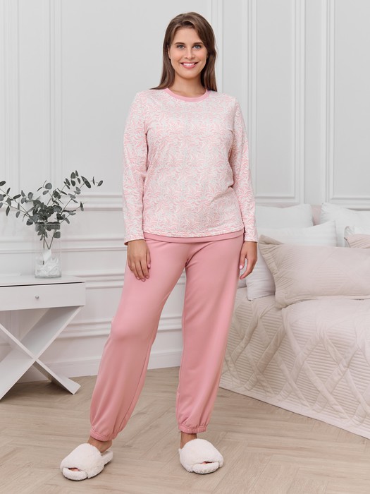 Пижама женская из трикотажного полотна «микрофлис» в комбинации двух видов:с набивным рисунком и гладкокрашеного в единой цветовой гамме, состоящая из футболки и брюк. Футболка - из полотна с набивным рисунком, классического покроя, с длинными втачными рукавами, горловиной овальной формы, обработанной втачной планкой. Низ изделия, горловина обработаны притачными планками из контрастного материала.Брюки – свободного покроя, с эластичной тесьмой по талии и нижним срезам.