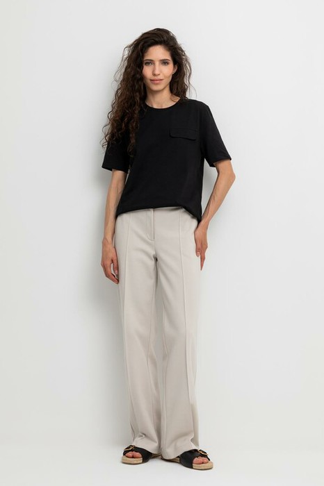 Свободные женские брюки со стрелками и боковыми карманами из плотного гладкого трикотажа интерлок. Застегиваются на молнию и кнопку. Низ обработан плоскими швами.