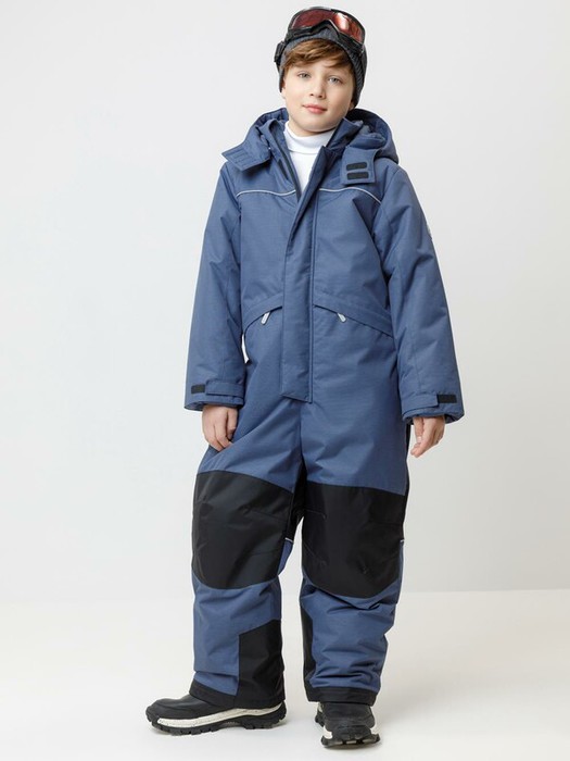 Зимний комбинезон для мальчика с утеплителем Fellex®: 250 г/м2 . Выполнен из мембранной ткани с дополнительной тефлоновой обработкой, которая предохраняет изделие от загрязнений и отталкивает влагу. Подклад выполнен из 100% полиэстера Tricot. Комбинезон застёгивается на молнию и внешнюю планку на липучках и кнопках, предусмотрена защита подбородка. Съёмный капюшон имеет эластичную резинку по бокам. Резинка по спинке обеспечивает лучшее прилегание. По бокам два кармана на молнии. На рукавах эластичные внутренние манжеты, ширина регулируется при помощи липучки. Внутренняя противоснежная юбка по низу изделия защищает обувь от попадания снега и удерживает комбинезон в закреплённом положении. В размерах с 98-104 по 116-122  предусмотрены отстёгивающиеся штрипки. Во всех изделиях верхнего ассортимента для безопасности ребёнка предусмотрены светоотражающие элементы.