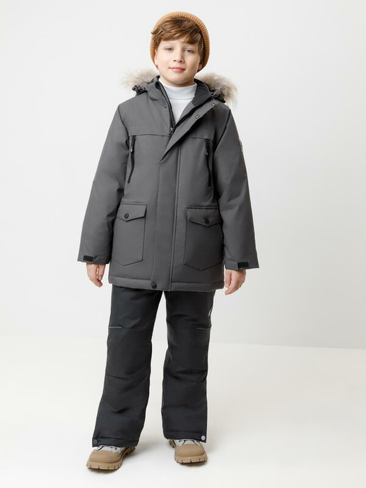 Зимняя куртка для мальчика с утеплителем  SEE®: 250 г/м2. Выполнена из мембранной ткани с дополнительной тефлоновой обработкой, которая предохраняет изделие от загрязнений и отталкивает влагу. Подклад выполнен из 100% полиэстера Tricot. Куртка застёгивается на молнию и внешнюю планку с металлическими кнопками, предусмотрена защита подбородка. Съёмный капюшон на кнопках и липучках имеет эластичную утяжку со стопперами и отстёгивающуюся опушку из искусственного меха, регулируется по глубине. На рукавах внутренние эластичные манжеты, ширина рукава регулируется при помощи липучки. По бокам два накладных кармана и два кармана с молниями на груди. По талии эластичная утяжка со стопперами. Во всех изделиях верхнего ассортимента для безопасности ребёнка предусмотрены светоотражающие элементы.