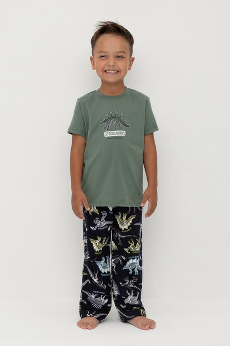 Трикотажная пижама из натурального хлопка. Футболка с короткими рукавами с принтом. У брюк эластичный пояс на резинке. Оригинальные принт и набивка выполнены из стойких, гипоаллергенных текстильных красителей. Пижама сохраняет цвет и форму после многократных стирок. Все трикотажные полотна производятся в соответсвии с нормами Швейцарского сертификата ЭкоТекс.
