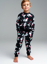 Трикотажный пижамный комплект из натурального хлопка. У футболки короткие рукава. Брюки с удобным поясом на резинке и утягивающим плетеным шнуром. Оригинальная набивка и принт выполнены из стойких, гипоаллергенных текстильных красителей. Все трикотажные полотна производятся в соответствии с нормами Швейцарского сертификата ЭкоТекс.