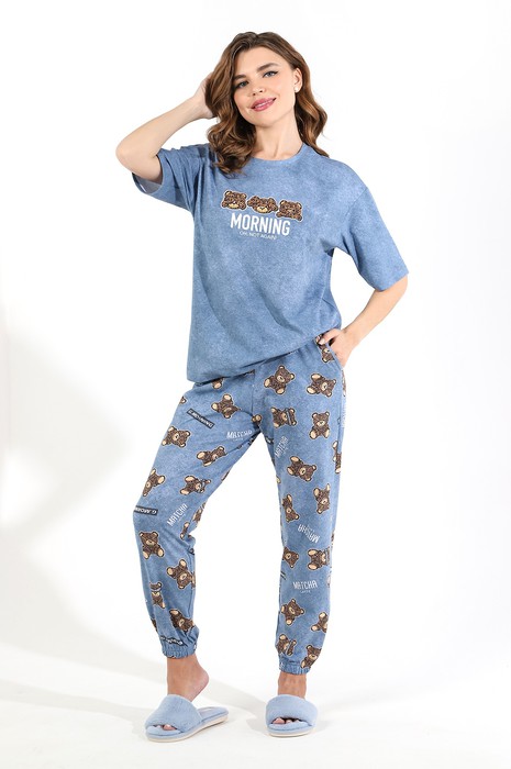 Костюм молодежный из трикотажного полотна «кулирка» в сочетании двух видов: гладкокрашеного с эффектом «варенки» и с набивным рисунком, состоящий из футболки и шорт. Футболка – с короткими втачными рукавами, свободного покроя, горловиной овальной формы, обработанной притачной бейкой из основного материала и принтом в центре полочки, выполненным в технике «шелкографии».Брюки – свободного покроя, с эластичной тесьмой по талии и нижним срезам, карманами в боковых швах.