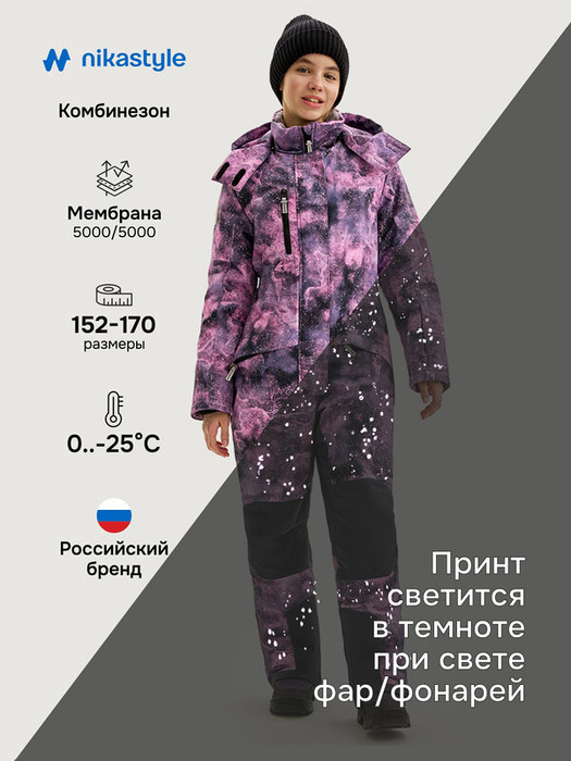 Комбинезон ВСЕЛЕННАЯ из мембранной ткани 5000/5000 с водо-грязеотталкивающей технологией TEFLON. Мембранная ткань это не продуваемый и водонепроницаемый материал, который надежно защищает от ветра и влаги. Благодаря дышащим свойствам мембраны ребенку будет комфортно в любую погоду, и он не вспотеет. Дополнительно на ткань нанесен светоотражающий принт.  Ткань обработана снаружи экологически чистым протектором TEFLON для защиты от воды и грязи. Мембрана в сочетании с утеплителем нового поколения FIBERlite сохраняет тепло во время прогулок, позволяя телу дышать. Флисовая подкладка отводит влагу и имеет хорошие теплоизоляционные свойства.Функционал: - центральная застежка и карманы на молнии, - внутренний карман на молнии, - ветрозащитная планка, - съемный капюшон на молнии, - кулиса для регулировки объема по капюшону и по талии, - карман на рукаве под ски-пасс, - внутренние бретели для возможности снять верхнюю часть изделия в помещении.  Мы все продумали до мелочей, поэтому модель дополнительно оснащена:- трикотажными манжетами, - снегозащитными муфтами на брючинах, - регулировкой объема брюк под обувь на молнии, - флисовой подкладкой до середины бедра, - светоотражающими элементами для безопасности ребенка в темное время суток.  Область колен и шов сидения проклеены, места повышенного трения выполнены из усиленной ткани.Комфортная температура эксплуатации от 0°С до -25° С. Рекомендуем приобрести комплектом аксессуары, обувь и другие вещи из капсулы в карточке товара, которые отлично сочетаются с изделиями коллекции.