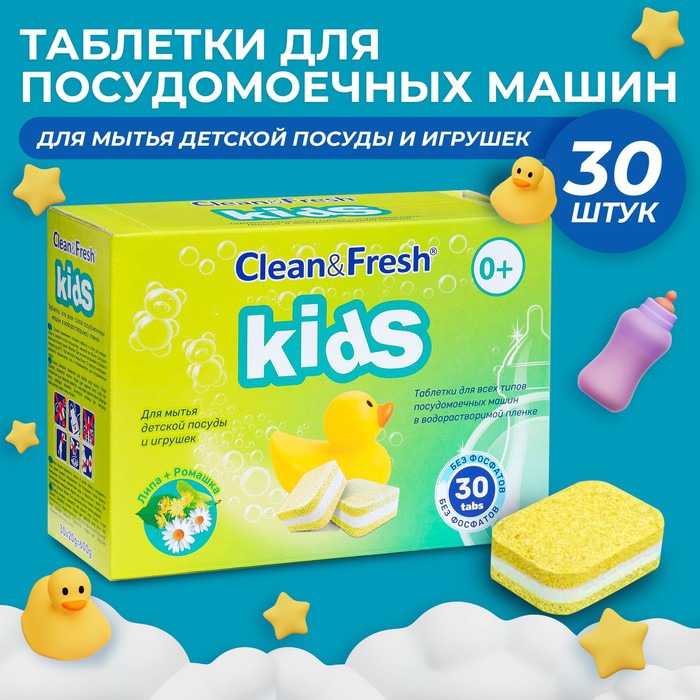 Биоразлагаемые чистящие эко-таблетки для посудомоечных машин детские Clean & Fresh специально разработаны с заботой о природе. Формула экотаблеток не содержит фосфатов и агрессивных веществ. Таблетки для посудомоечной машины обладают водорастворимой пленкой.