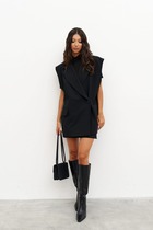 Жилет молодежный из трикотажного полотна «дабл-флис» (двухсторонний флис), прямого силуэта, с воротником «стойка», центральной бортовой застежкой на тесьму «молния». Для создания диагональных линий боковые швы переведены на полочку и оформлены в рельефные швы, в которых обработаны карманы.