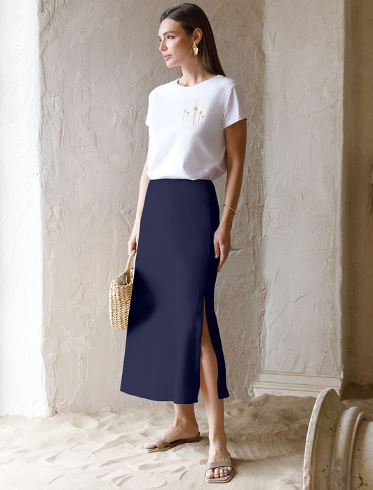Состав: 70%Лиоцелл (Вис) 30%ПЭ Параметры модели на первом фото: Рост 172, бюст 88, талия 64, бедра 88Юбка с разрезом выполнена из плотного лиоцелла. Модель, скроенная по косой мягко, струится по телу и отлично драпируется. Удобный пояс на эластичной резинке. В теплое время года ткань приятно охлаждает кожу. Добавление синтетических волокон в составе изделия, предотвращает сминаемостьи поддерживает формоустойчивость. Юбка сочетается в костюме с топом D23.063, блузкой D29.266, D29.267 и жилетом D27.002