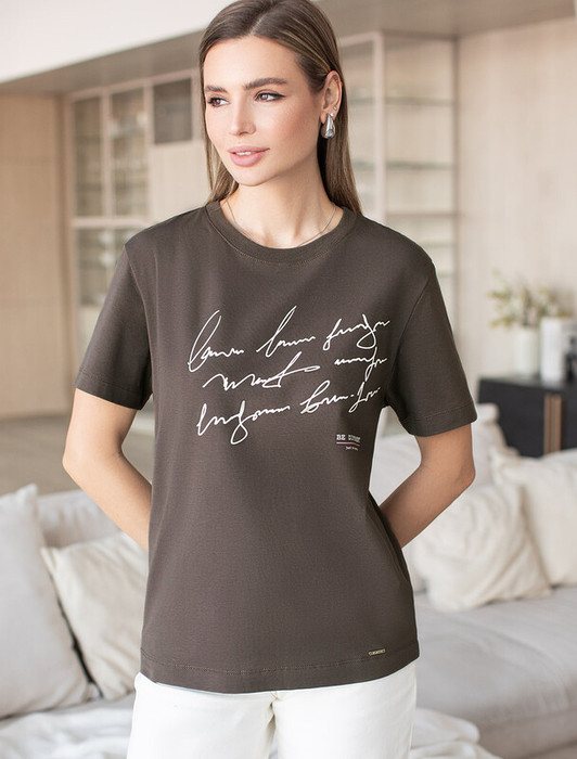 Совместные покупки Пермь Женская одежда Футболки — Акция Vilatte Футболка из премиального хлопка с авторским принтом D49.983 кофе_