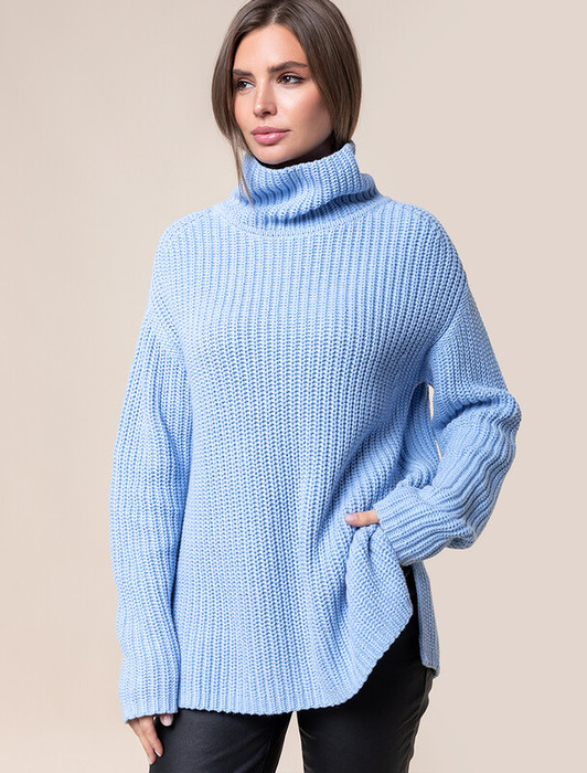Свободный свитер с высоким воротником небесно-голубого оттенка. Модель со спущенной линией плеч выполнили крупной фактурной вязкой из мягкого хлопка с акрилом Изделие из такой пряжи получилось невероятно теплым и приятным на ощупь. Подходит для любого типа фигуры.