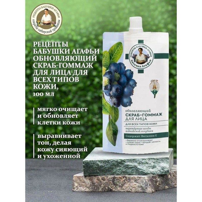 Обновляющий скраб-гоммаж для лица Объединив современные косметические разработки и традиционные рецепты сибирской травницы, мы создали для вас целебную серию «Аптечка Агафьи». Обновляющий скраб-гоммаж для лица на основе талой воды создан по старинным рецептам Агафьи Тихоновны Ермаковой. Он мягко очищает и обновляет клетки кожи, активные натуральные компоненты выравнивают тон, делая кожу сияющий и ухоженной.