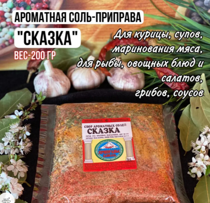СОСТАВ ПРОДУКТА: Соль-приправа «СКАЗКА» состоит из 4х Кавказских солей: Ореховой, Чесночной, Сванской, Адыгейской и прованских трав, сушеных овощей и Грузинских специи. Таким образом вам уже не нужны другие соли, поскольку состав «СКАЗКИ» уже содержит все необходимое!