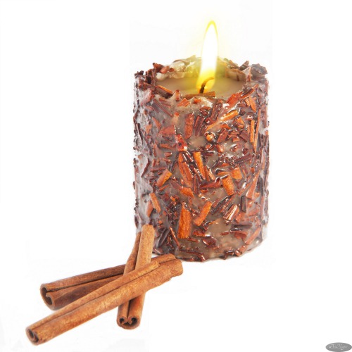 Эта свеча отличается оригинальным дизайном. Для ее украшения использовались дробленые коричные палочки.