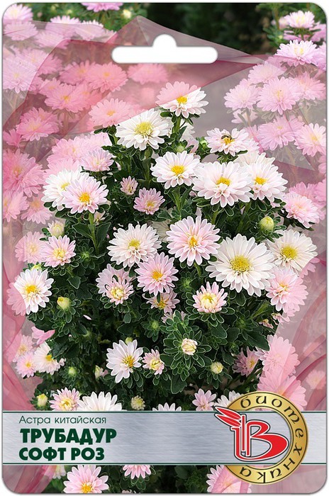 Долгожданный результат работы с сортотипом “Мацумото”.; Триумфальное развитие одного из самых очаровательных и сложных селекционных направлений астры.; Сочетание качества и стойкости многоцветковой кустовой хризантемы и очарование астры – вот что собой представляет серия Трубадур; - одно растение образует 30-40 боковых побегов второго порядка, формирующих цветки; - каждое отдельное растение представляет собой роскошный букет с более чем 30-ю одновременно раскрытыми цветками; - цветки диаметром 2,5-3 см, состоящие из ланцетовидных лепестков, расположенных по окружности в несколько слоев, чем ближе лепестки к центру цветка, тем они меньше, что обеспечивает очаровательную махровость; - высота растения 45-60 см, стебель толстый и прочный, активно формирует цветоносы второго порядка; - использование – получение высококачественной срезки для букетов; Посев: апрель-начало мая для цветения в августе-сентябре. Семена равномерно распределяют по поверхности подготовленного стерильного (для избежания поражения сеянцев черной ножкой) грунта, слегка присыпают субстратом, полив теплой водой.; Прорастание: 12-16 дней при температуре 15-16 °С.; Пикировка: в фазе 2-3 настоящих листьев растения пикируют в горшки диаметром 6 см. Оптимальная температура при выращивании 14-16°С.; Высадка в грунт: рассаду высаживают в грунт в возрасте 40-50 дней. При высадке рекомендуется схема 15x20 см, 32 растения на м кв.; Грунт: богатые гумусом суглинистые почвы, рН 5,5-6,5.; Удобрение: комплексное минеральное, с преобладающим содержанием азота.; Особенности: не рекомендуется выращивать астры на одном месте более одного года. Не допускать плотных посадок, чтобы избежать поражения грибковыми заболеваниями.; Астры от-кутюр; Астра китайская Трубадур