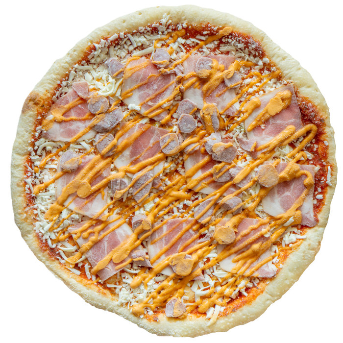Супер мясная пицца с пикантными колбасками, беконом и горчичным соусом.