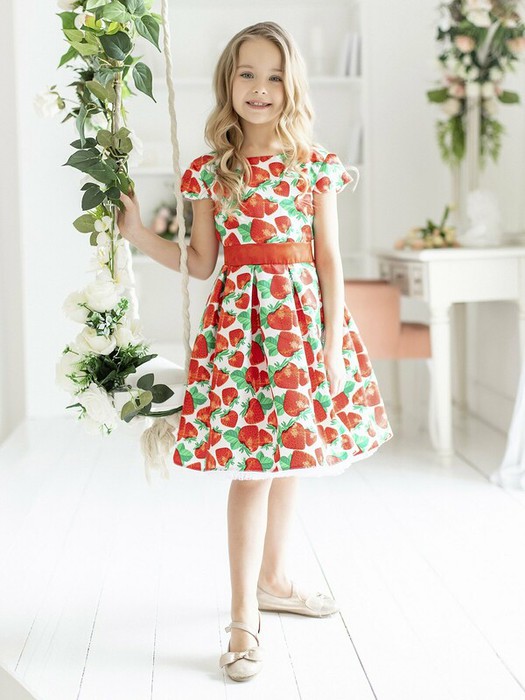 Нарядное платье с пышной юбкой. Подкладка 100% хлопок. Короткий рукав, застежка на молнию на спинке. Пышный подъюбник.Особенности модели: На спинке имеется поясок чтобы дополнительно утянуть талию Бело-красный цветРисунок с ягодамиХарактеристики:Размеры (рост): 98-134Ткань верха: Сатин - Полиэстер Сетка - ПолиэстерПодкладка 100% хлопокПроизводитель: batik