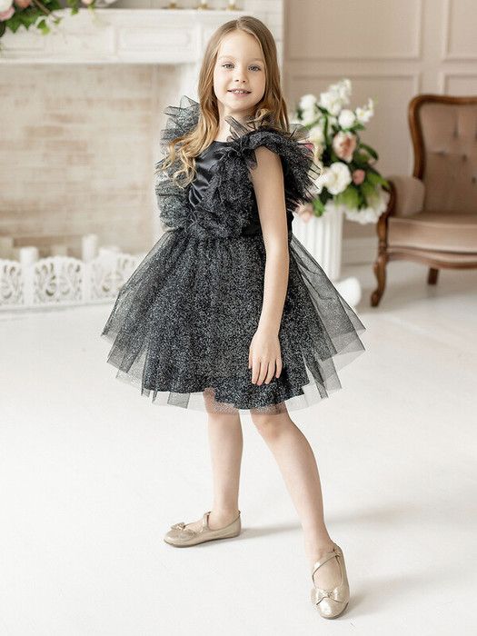 Нарядное платье с пышной юбкой и рюшами из фатина, с декоративным бантом на поясе сзади. На спинке имеется поясок чтобы дополнительно утянуть талию. Подкладка 100% хлопок.