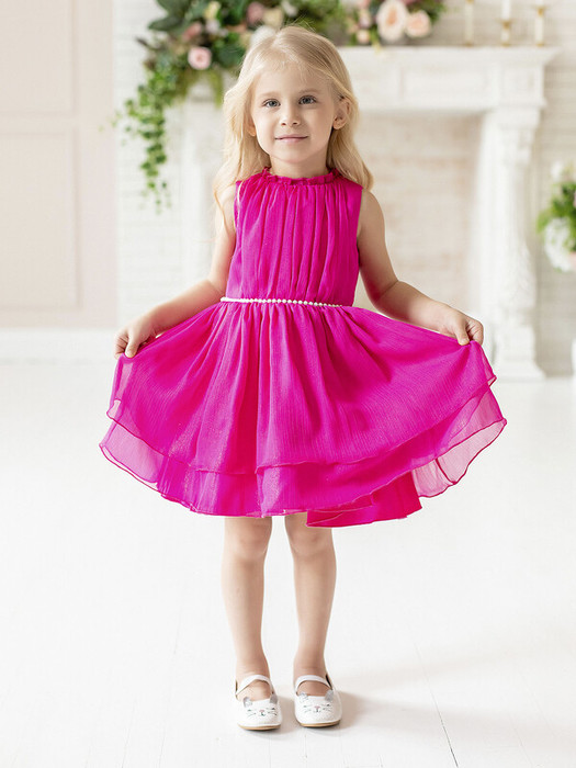 Нарядное ярко-розовое платье в романтичном стиле без рукавов. Поясок из бусин. Подкладка 100% хлопок. Характеристики:Размеры (рост): 98-134Ткань верха: Сатин - Полиэстер Сетка - ПолиэстерПодкладка 100% хлопокПроизводитель: batik