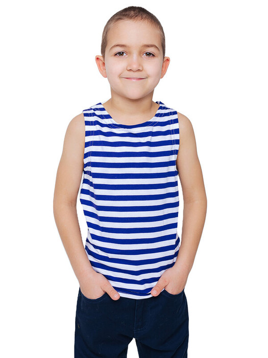 Майка тельняшка детская в синюю полоску из натурального хлопка. Майка-тельняшка прямого силуэта с круглым вырезом горловины, 100% хлопок.  Можно использовать в качестве нательного белья, одежды для дома и карнавальных образов.Характеристики:Ткань:  95% хлопок, 5% лайкраПроизводитель: batik