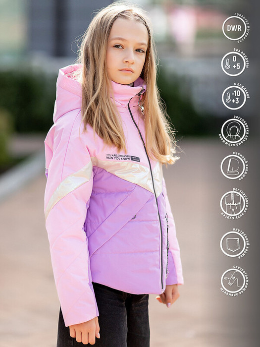 Стильная куртка для девочек Канди эргономичного кроя. Выполнена в нежно-сиреневой палитре цветов с перламутровой вставкой. Регулировка объёма капюшона, низа куртки и водоотталкивающая пропитка ткани обеспечат надежную защиту и комфорт в любую непогоду. Спереди прорезные карманы на молнии, а сама модель дополнена светоотражающими элементами. Особенности: Водоотталкивающая пропитка материала DWR Регулировка объёма капюшона Съемный капюшонРегулировка по низу курткиВнутренний карманСветоотражающие элементы Характеристики:Ткань верха: мембранаПодклад: микрофлисУтеплитель: 100 гр Температурный режим от +5 до -10СПроизводитель: batik