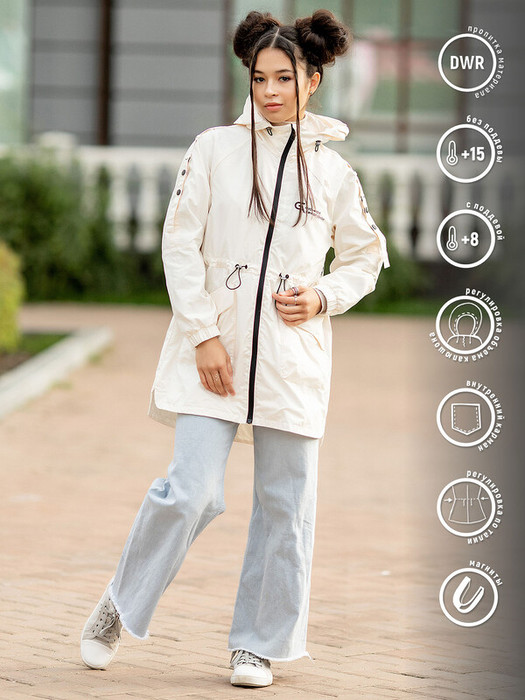 Ветровка-пыльник для девочки Джун из коллекции Весна-2023 с капюшоном в расцветке шампань представляет собой демисезонную удлиненную парку из курточной ткани с водоотталкивающей пропиткой. Застегивается на центральную молнию с защитой подбородка на воротнике. На груди небольшая надпись. Слегка удлиненная спинка, разрезы по бокам.   Особенности:  Регулируемый капюшон трансформируется в воротник На рукаве хлястики-утяжки на кнопках  Эластичный низ рукава Регулировка по талии Накладные карманы с клапаном на магните Светоотражающие термотрансферы Характеристики:Ткань верха: Курточная ткань с водоотталкивающей пропиткой Подклад: полиэстер/сеткаУтеплитель: нет Температурный режим: + 8 С (с поддевой), +15 С (без поддевы)Производитель: batik