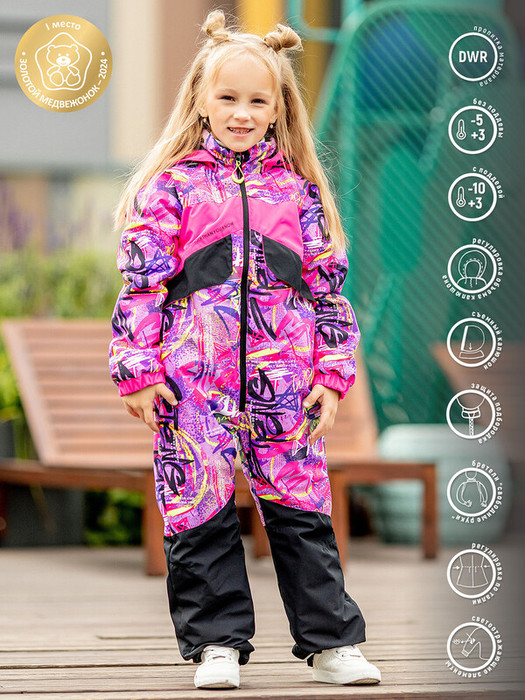 Яркий, принтованный активный комбинезон для мальчиков и девочек. Спереди внешние нагрудные карманы, утяжка по талии и по низу брюк. Светоотражающие элементы не оставят ребенка незамеченным в темное время суток, а эргономичный крой и мембранная ткань с водоотталкивающей пропиткой обеспечат комфортное времяпровождение в любую погоду.