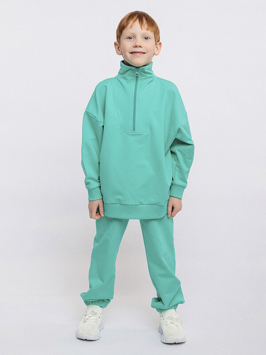 Комплект детский из футера зеленый: джемпер и брюки. Яркий спортивный комплект в стиле оверсайз. Костюм для девочек и мальчиков предназначен для носки в прохладных помещениях и прогулки на улице, выполнен из плотного футера. Джемпер с воротником стойкой, спущенным рукавом на манжетах. Брюки с резинкой в нижней части.Характеристики:Ткань: Футер 2х нитка 95% хлопок 5% лайкраПроизводитель: batik