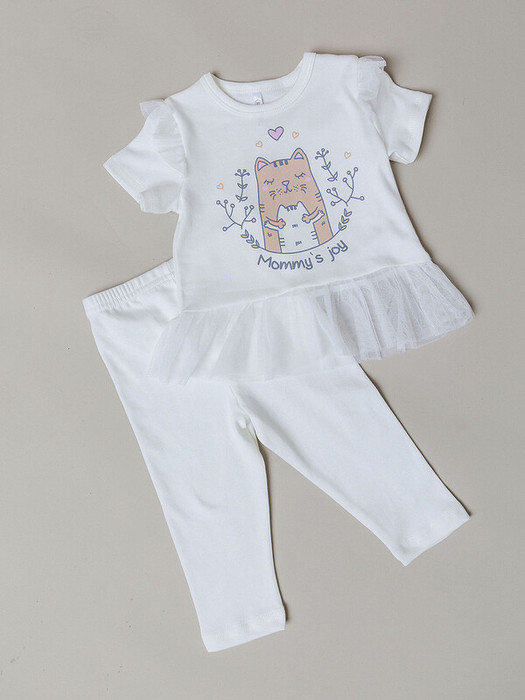 Комплект для девочки в молочном цвете: футболка с коротким рукавом и леггинсы. Футболка с рисунком украшена оборками и прозрачной юбочкой по низу. Леггинсы однотонные на мягкой резинке.Характеристики:Ткань: Интерлок пенье 100% хлопокПроизводитель: batik