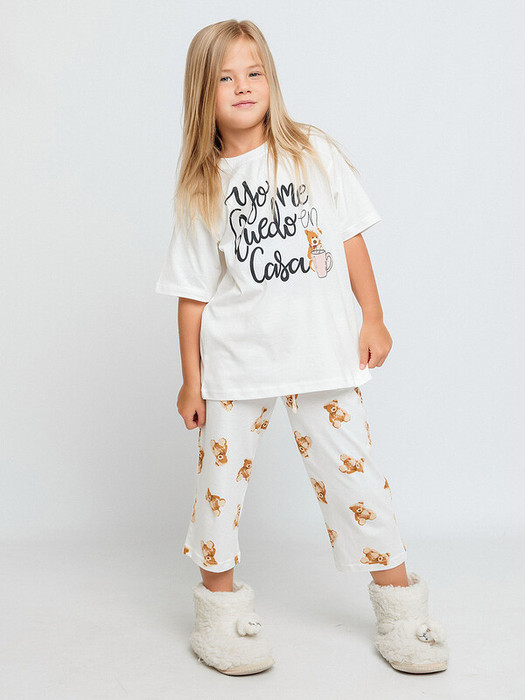 Пижама для девочки трикотажная из супрема: футболка с коротким рукавом и брюки. Детская пижама сшита из 100% натурального гипоаллергенного хлопка. Пижама подойдет для сна дома и в детском саду, а также можно носить как домашний костюм. Белая расцветка и принт в виде мишек.Характеристики:Материал: Супрем пенье 100% хлопокПроизводитель: batik