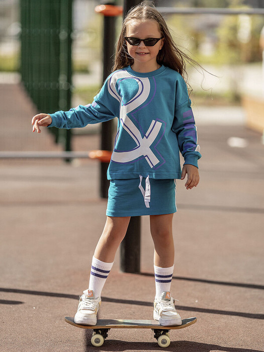Свитшот для девочки с длинным рукавом бирюзовый из футера. Контрастный принт.