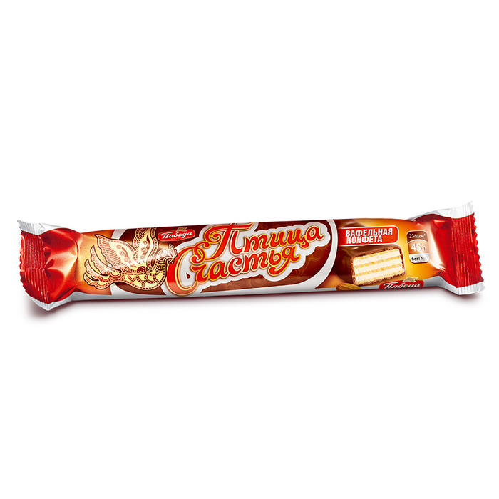 Шоколадный батончик «Птица счастья» фабрики «Победа» – вкус, любимый с детства. Нежная начинка из миндального пралине, четыре слоя вафли и настоящий сливочный шоколад. Звучит как счастье!