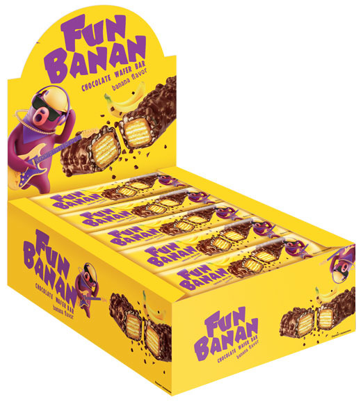 Вафля с прослойкой со вкусом банана, покрытая мягкой карамелью и пшеничными шариками с шоколадным вкусом.