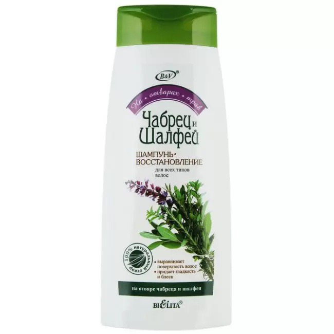 Шампунь-восстановление содержит полезный комплекс отвара чабреца и шалфея, который эффективно восстанавливает структуру волос, делая их гладкими, блестящими и шелковистыми.