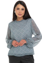 Блузка в горох с объемными рукавами на манжетах прекрасно впишется в любой гардероб. Изделие с планкой на пуговицах прекрасно сидит на фигуре, прямой крой вещи вытягивает силуэт, скрывает несовершенства и подчёркивает достоинства. Модель из крепа подойдет для носки в теплую погоду, зимой под жакет, жилет, кардиган, прекрасно сочетается не только с классическими брюками и юбками. Дизайнерская брошь ручной работы дополняет и украшает блузку.
