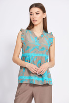 Блузка прямого силуэта. Горловина обработана отложным воротником-стойкой, по переду расположены симметричные складки и декоративная капелька, по спинке с застежкой на навесную петлю и пуговицу. Спинка со средним швом. Рукав втачной прямой длинный, по низу со сборкой и манжетой с застежкой на петлю и пуговицу.