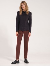Блузка прямого силуэта. Горловина обработана отложным воротником-стойкой, по  переду расположены симметричные складки и декоративная капелька, по спинке с застежкой на навесную петлю и пуговицу. Спинка со средним швом. Рукав втачной прямой длинный, по низу со сборкой и манжетой с застежкой на петли и пуговицы.