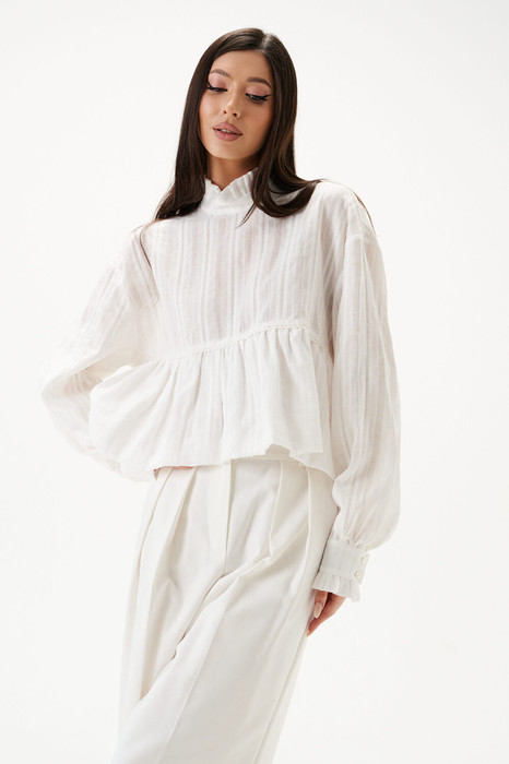 Блуза свободного кроя, силуэт "трапеция". Выполнена из хлопкового полотна. Воротник-стойка с рюшей по верхнему срезу. По стороне спинки разрез с застежкой на навесную петлю и пришивную пуговицу. Линия плеча спущенная. Рукав втачной, с манжетой с рюшей, застегивающаяся на пуговицы. Верхняя часть лифа со средним швом по спинке. Нижняя часть блузки-рюша с мягким подгибом по низу. Длина рукава 60 см. Длина спинки 52 см